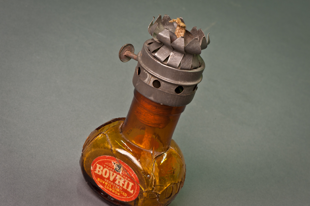 After one of the first and most disastrous battles in the Boer War at Talana Hill on 20 October 1899, the 1st Battalion of the Royal Irish Fusiliers were forced to retreat, marching 60 miles in 86 hours and leaving most of their equipment and belongings behind. They sought refuge in the town of Ladysmith and after attempting to fight their way out several times, were ultimately trapped and besieged by the Boer forces. The Royal Irish Fusilier officers and men used whatever came to hand to supply their needs. One of their officers, Major Douglas Churcher, a veteran of the campaign in The Sudan in 1897, converted this 10cm high Bovril bottle into an oil lamp.