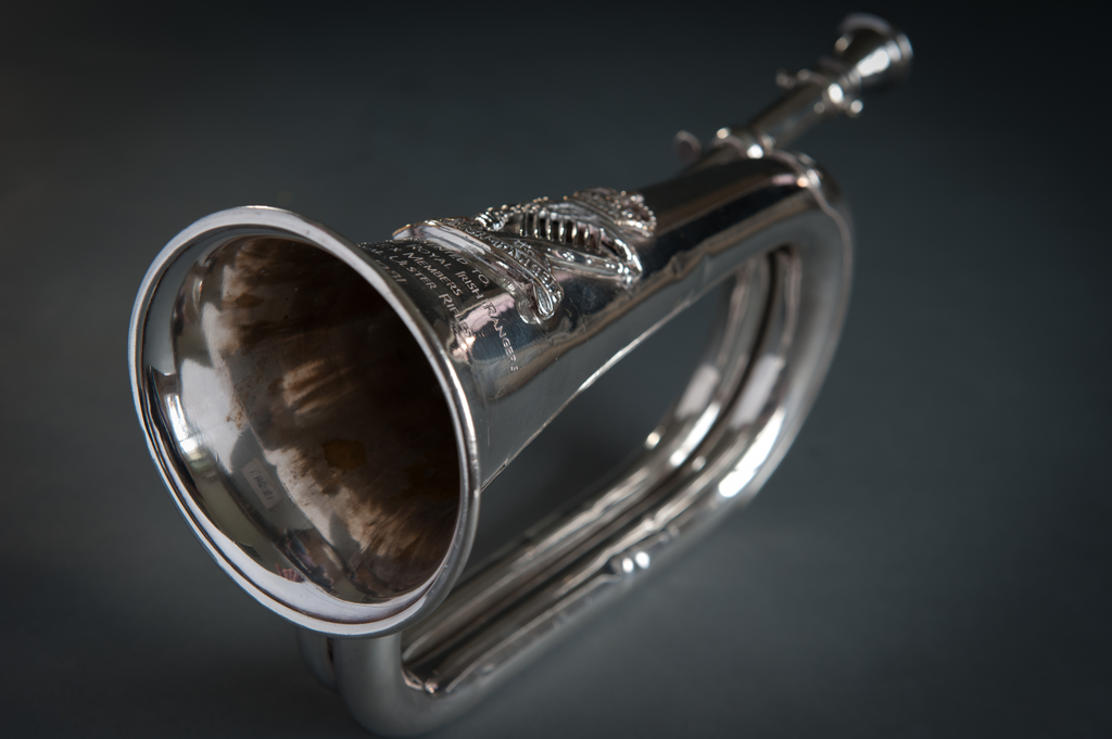 This bugle, which belonged to The Royal Ulster Rifles, was presented by former members of that Regiment to The Royal Irish Rangers. It is decorated with the cap badge of The Royal Irish Rangers and bears an inscription which reads 'Presented to 2nd Bn The Royal Irish Rangers by Ex Members, The Royal Ulster Rifles. Sept 1981. Quis Separabit'. To this day bugles are used in The Royal Irish Regiment. Most evocatively they will always be heard playing Last Post and Reveille at the funeral of a soldier and at Services of Remembrance.