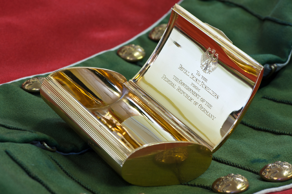 In the post-war years The Royal Irish Fusiliers made many representations to the government of The Federal Republic of Germany to have their Regimental Silver traced and returned. By way of compensation, West Germany had this gold snuff box made and presented to the Regiment in 1953 during its posting to Berlin 'as a tribute to all the good work done by the British Army and the help it has given in Germany.