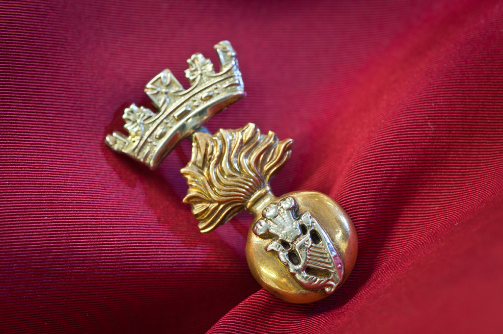The Prince of Wales feathers and harp were bestowed on the 87th Regiment following its great victory at the Battle of Barrosa in 1811. The flaming grenade was a common element in the cap badges of all infantry regiments granted the distinction 'Fusiliers'. In 1827, King George IV approved the 87th this distinction with the title 'Prince of Wales's Own Irish Fusiliers' and some months later adding 'Royal' to become 'Royal Irish Fusiliers'.