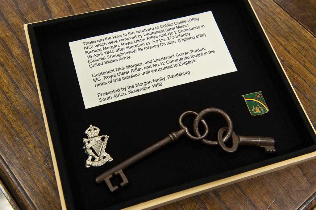 These are the keys to the courtyard of Colditz Castle (Oflag IV-C) which were removed by Lieutenant (later Major) Richard Morgan, Royal Ulster Rifles and No.2 Commando in 16 April 1945 after liberation by 3rd Bn. 273 Infantry (Colonel Shaughnessy) 69 Infantry Division (Fighting 69th) United States Army.