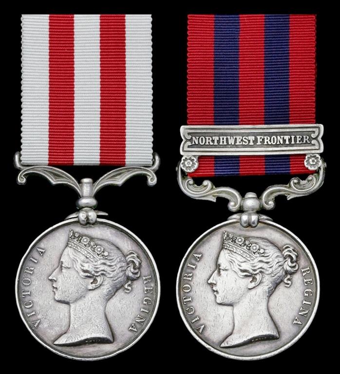 Private Bourke's medals (top right) included the Indian Mutiny 1857-59 and the India General Service 1854-95 with the Northwest Frontier clasp, the latter being rare in that is marked 'Pte. P. Bourke Peshr. Lt. Horse', as few were issued to those serving with the Peshawur Light Horse.