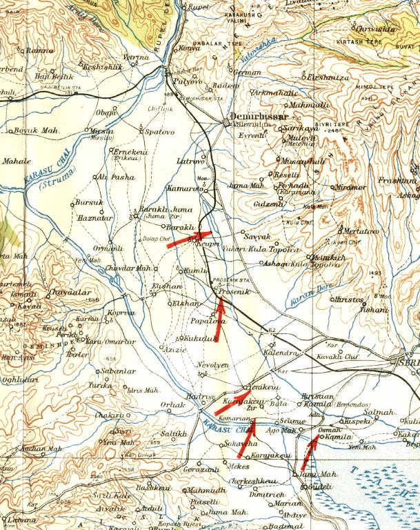 From 15 March 1917, the 6th Battalion The Royal Irish Rifles was in the Struma Valley at Elisan, in support of the right of the Brigade's frontage, with outposts at Kumli and Barakli on the Belica Stream. On 31 March, the Battalion was ordered to conduct reconnaissance forward of Kumli with the aim of establishing a new line that would serve as a bridgehead over the stream. By 24 March, new positions were constructed without opposition and these allowed the Rifles to scout forward. One of the posts was attacked on 28 March, but withdrew in good order to the Battalion's piquet line. Next day, a raid took place to test the dispositionas and strengths of the enemy in and around Kjupri. Following a successful operation, the raid revealed that the enemy strength was no more than 60 - 70.