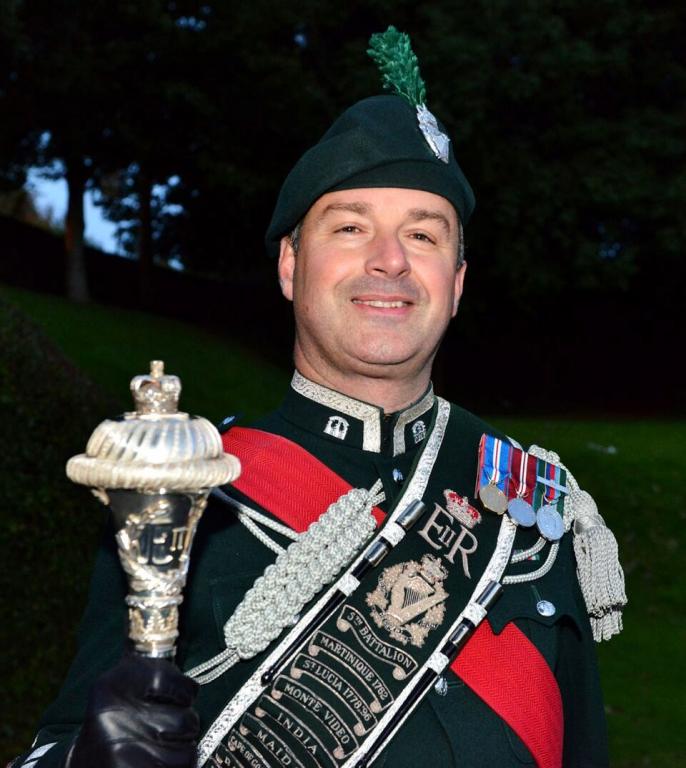 | A thoroughly modern Drum Major holding his Mace and wearing a Baldric (sash) emblazoned with embroidered Regimental Battle Honours. |