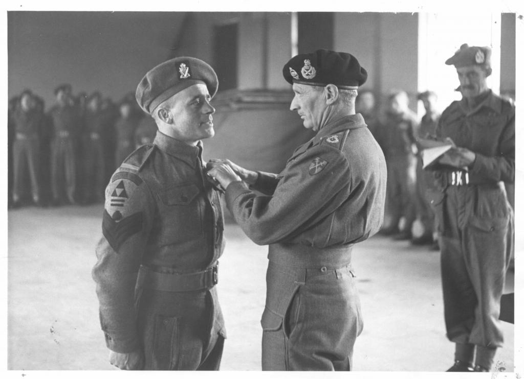 | Colour Serjeant Sharkey receives his DCM ribbon from Field Marshal Montgomery. |