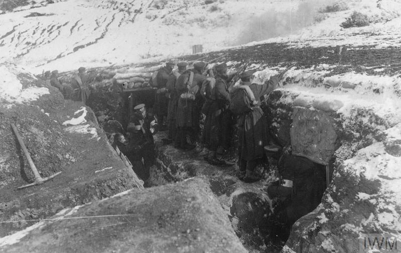 | Bulgarian infantry in a front line trench in Macedonia, February 1917. Note a medical orderly helping a wounded soldier on the left. |