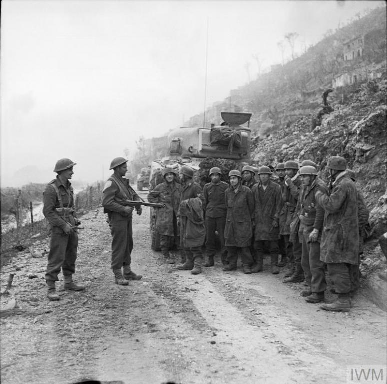 German prisoners captured by New Zealand troops are held at gunpoint on a road beside a Sherman tank.