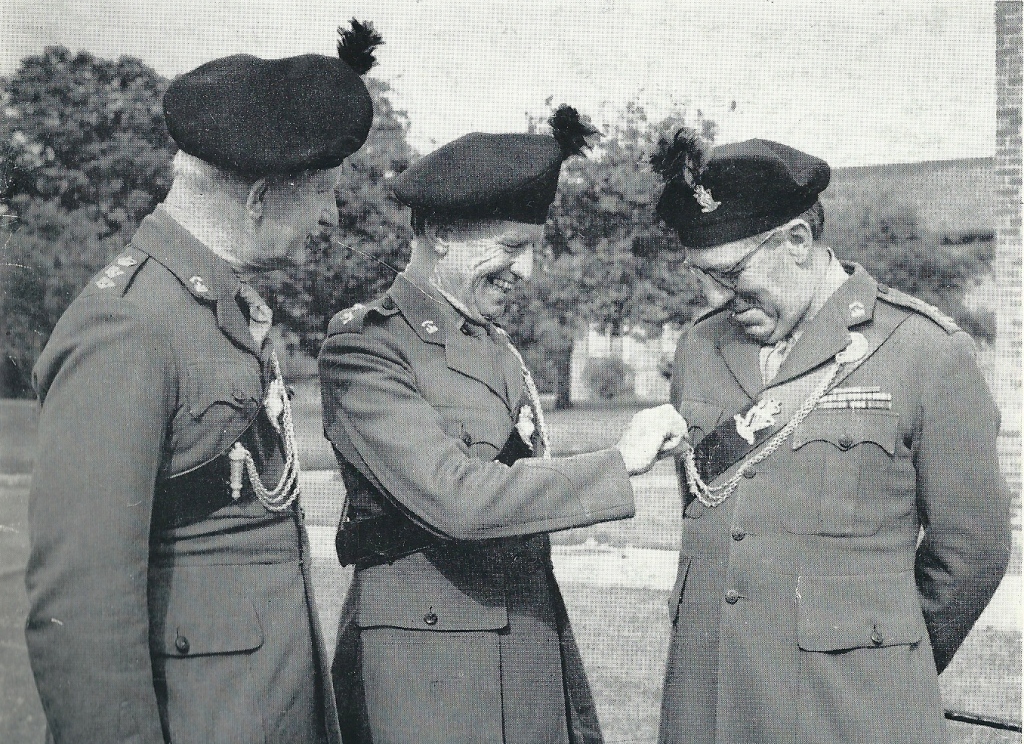 | Lieutenant General Sir Ian Harris, Colonel of the new Regiment introduces the Deputy Colonels Major General Pat Scott and Major General Harry Grimshaw to the intricacies of wearing a cross belt. |