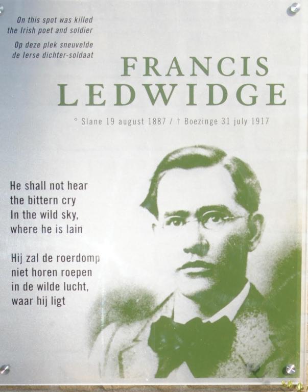 The Irish poet Francis Ledwidge was born on 9 August 1887 in the Boyne Valley at Janeville near the village of Slane in County Meath. He was variously described as the ‘peasant poet’, the ‘soldier poet’ and the ‘poet of the blackbirds’ and had seen action with the 5th Battalion The Royal Inniskilling Fusiliers in Gallipoli but suffered a back injury whilst serving in Serbia.