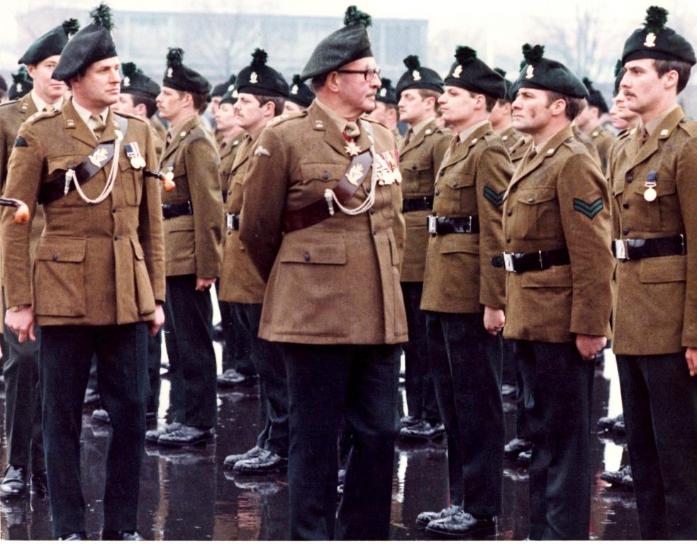 Major General H E N Bredin CB DSO MC on a rainy St Patrick's Day in Wavell Barracks, Berlin 1982.