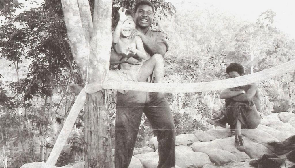 Behind the water pipe and wire, the boy Nyanin. Holding him is a Rifleman from Fiji, Peni Levaci, an all-round sportsman who played rugby and was an Army heavyweight boxer.