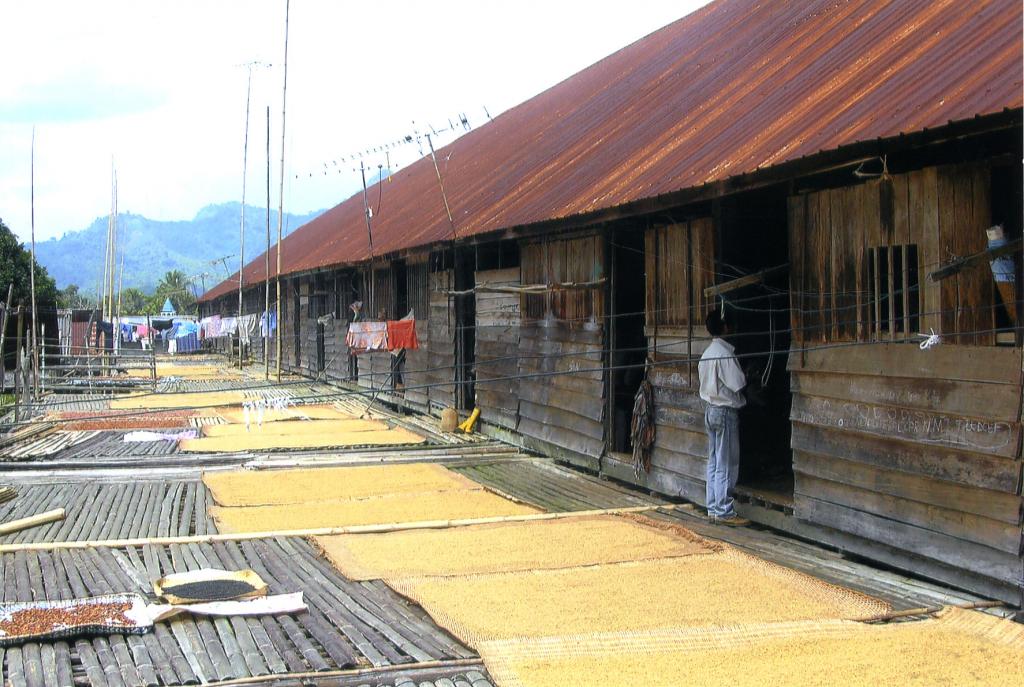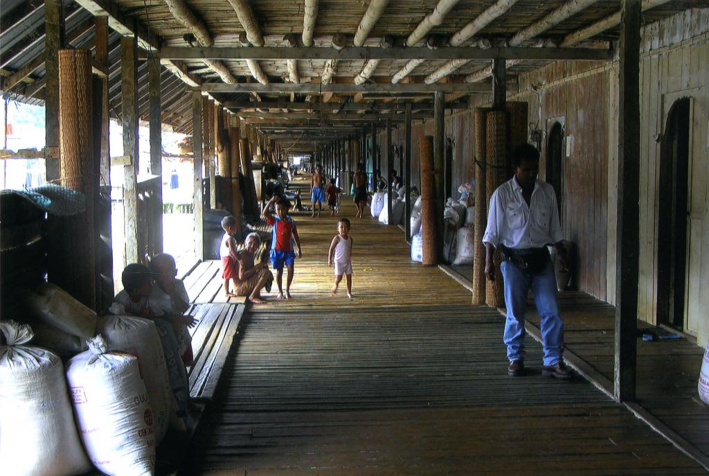 After refreshing juice straight from the coconut and bananas, we set off for Mujat and Mongkus, another 45 minutes by road instead of the day's patrol that it used to take us. Once again the Rifles jungle hat brought comment from the older Dyaks, whose longhouses have altered little in the last 40 years - just wriggly tin in place of the atap roof [Photos 11 & 12]. The Headman at Mujat appeared and immediately produced a visitors book, so the return of at least one old Rifleman was recorded, no doubt there will be others whom I am sure will receive just as warm a welcome as we did.