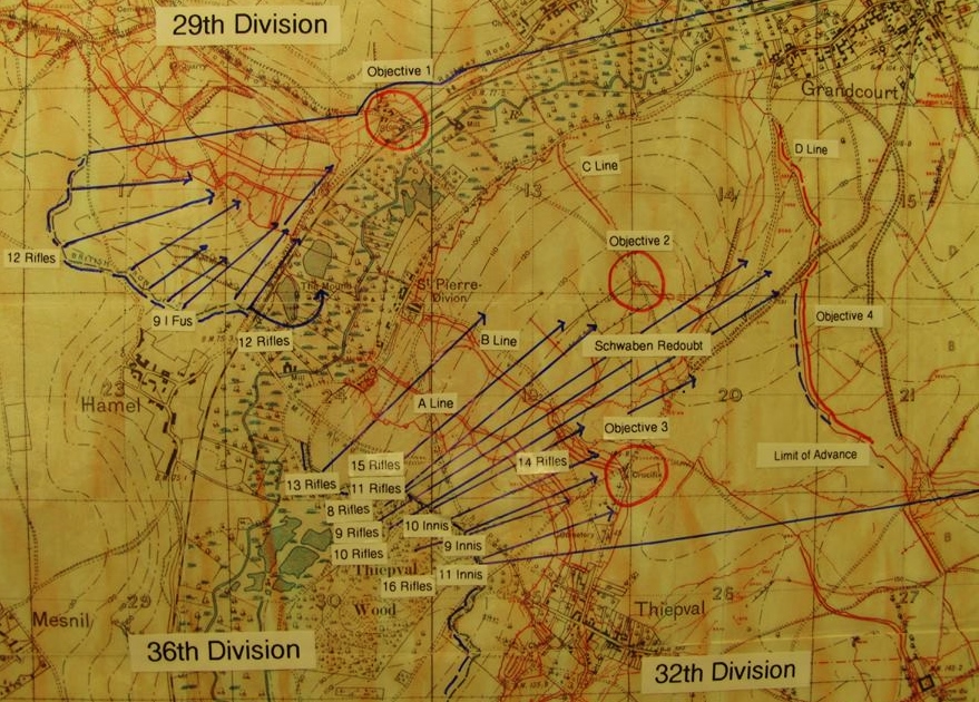 | 14th Battalion in 36th (Ulster) Division | Objective was Schwaben Redoubt in Battle of the Somme, France |